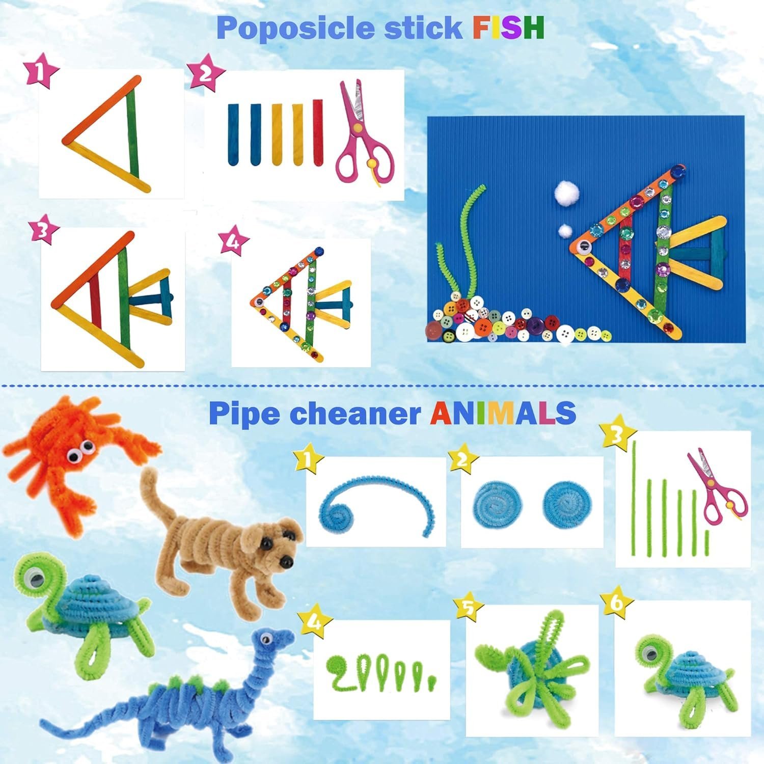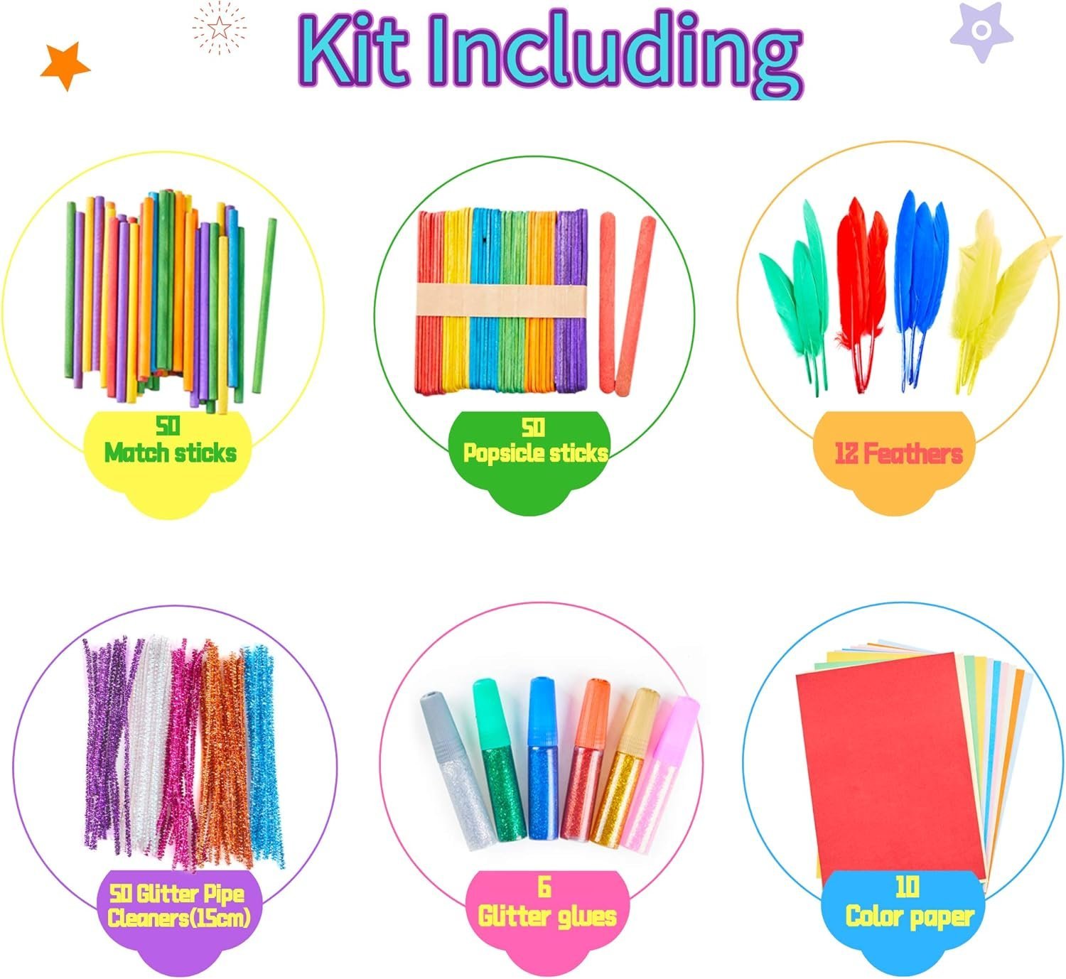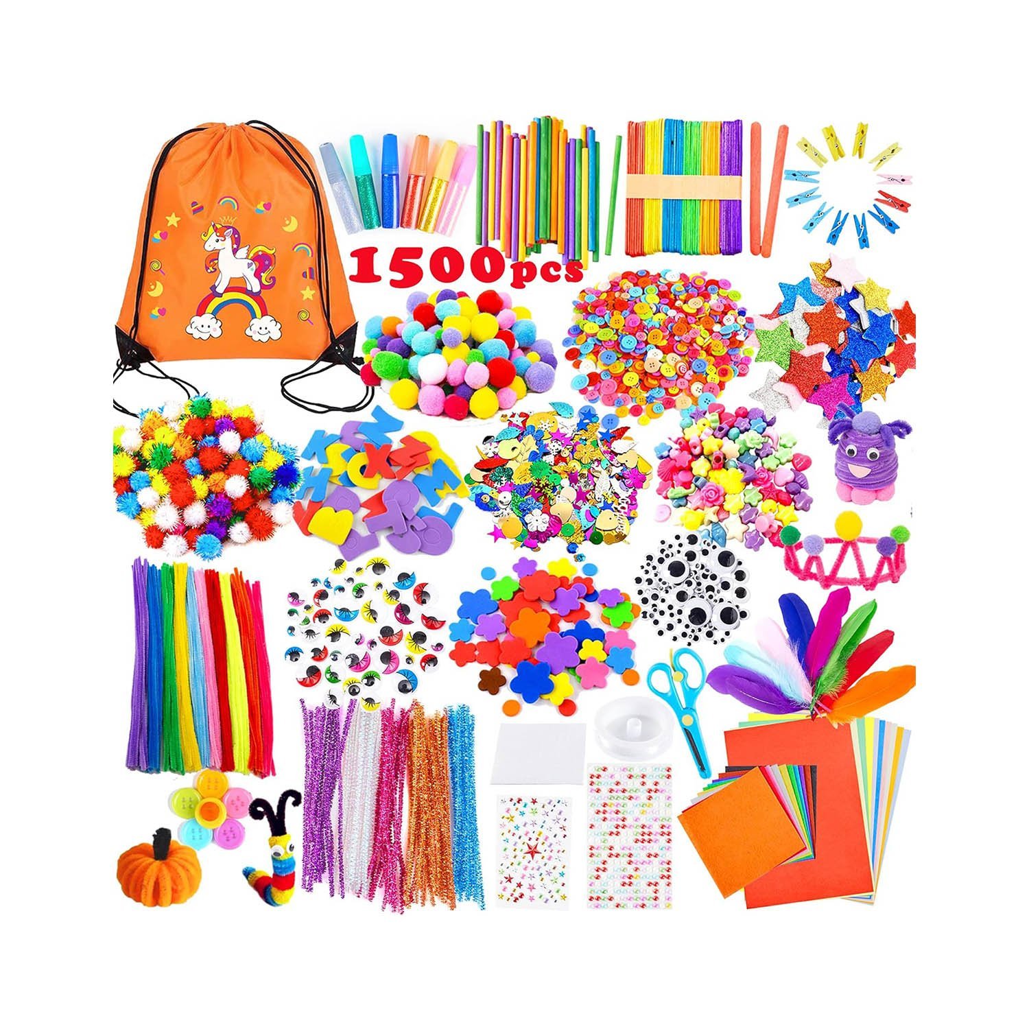- Ultimate Craft kit: Yetech Craft DIY Art Supplies comes with everything you need to build creativity. Includes glitter glue, pom poms, pipe cleaners, popsicle sticks, colorful feathers, diamond stickers, flower EVA stickers, Safety scissors, Sequins, Assorted Buttons, beads, strings, glue sticker, googly eyes & bag.